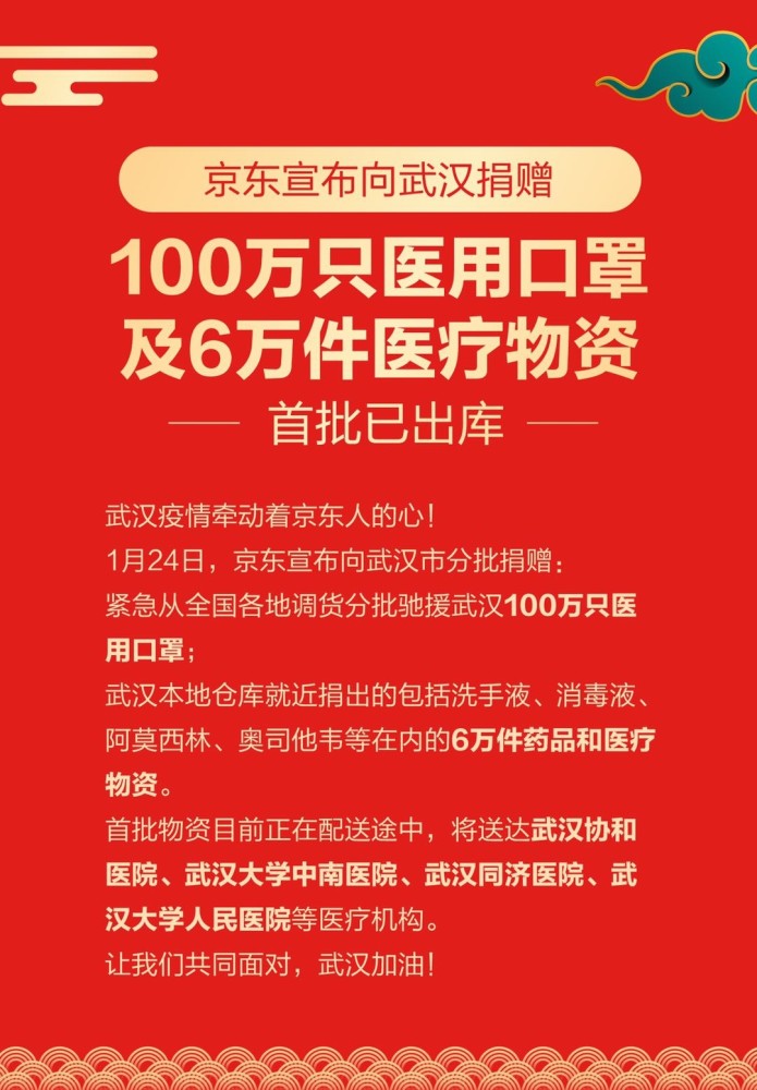 武汉疫情触动着京东人的心!今天,京东宣告向武汉市分批捐献100万只医用口罩及6万件医疗物资,以缓解当地医疗物资缺少的局势。这中心还包含:紧迫从全国各地调货分批驰援武汉100万只医用口罩,以及从武汉本地仓库就近捐出的包含洗手液、消毒液、阿莫西林、奥司他韦等在内的6万件药品和医疗物资。第一批物资现在正在配送途中,将赶快送达武汉协和医院、武汉大学中南医院、武汉同济医院、武汉大学人民医院等医疗机构。