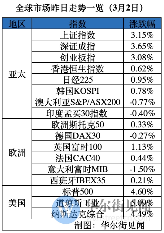 标普500指数收涨136.01点,涨幅4.60%,创2018年12月26日以来最大单日涨幅,报3090.23点,重返200日均线上方。道琼斯工业均匀指数收涨1293.96点,涨幅5.09%,创2009年3月23日以来最大单日涨幅,报26703.32点。 纳斯达克归纳指数收涨384.80点,涨幅4.49%,也创2018年12月26日以来最大单日涨幅,报8952.17点。