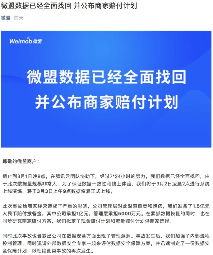 前天晚上,微盟官方发布布告称:“微盟数据现已全面找回 并发布商家赔付方案”。