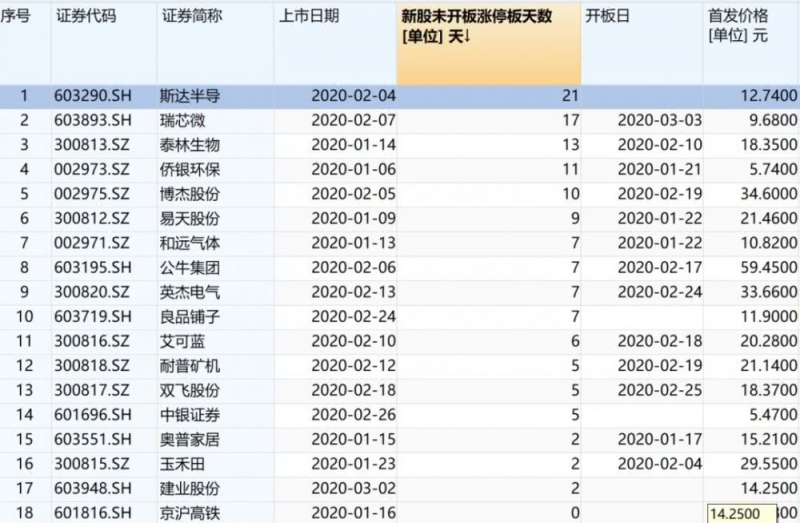 斯达半导上市后连拉22个“一”字板成为年内上市新股中连板数量最多的非科创板新股。东方财富多个方面数据显现,除掉科创板,2020年以来,到3月4日,两市共有18只新股成功登陆A股。3月4日之前,2020年以来连板数量最多的新股是瑞芯微。瑞芯微在2月7日登陆A股,上市后,瑞芯微接连走出17个涨停板才开板。