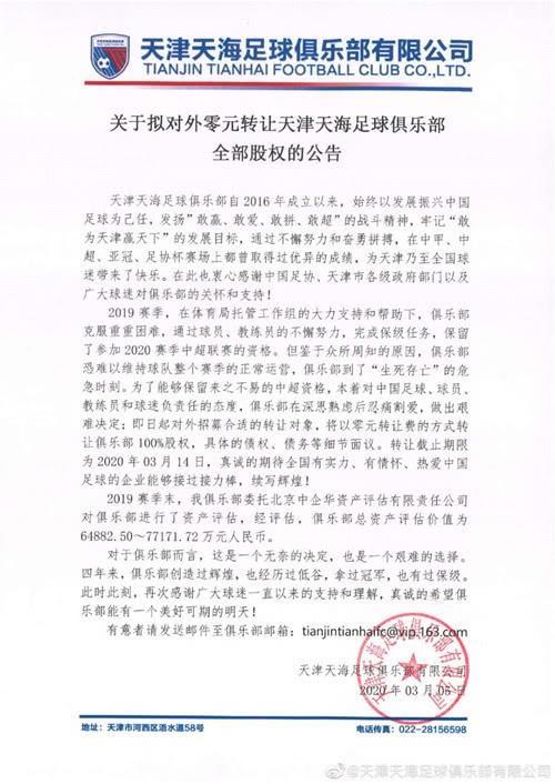 中国经济周刊-经济网讯 3月5日上午,中超球队天津天海发布公告表明,沙龙难以保持球队整个赛季的正常运营,即日起对外招募适宜的转让目标,将以零元转让费的方法转让沙龙100%股权,沙龙估值约7亿元人民币。