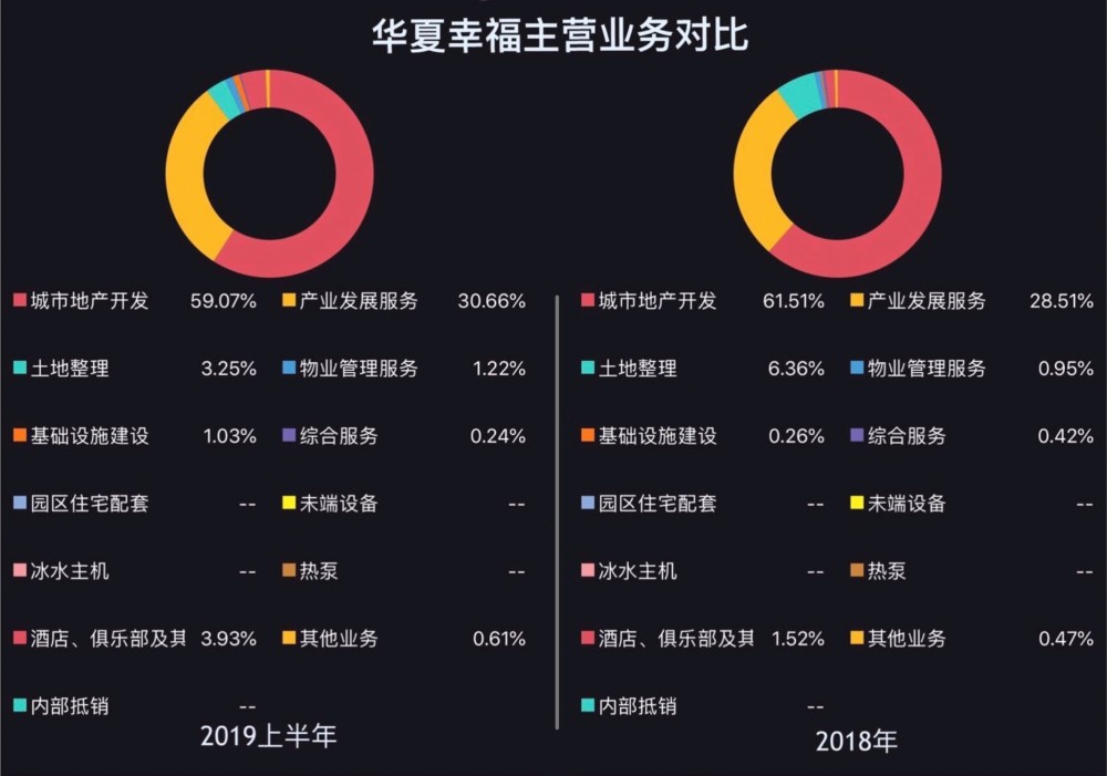 产业新城与商业办公及相关业务是华夏幸福的最主要业务板块。根据华夏幸福2018年财报,产业新城涉及的产业高质量发展服务业务在所有业务中占比28.51%,仅次于城市地产开发。2019年上半年,产业高质量发展服务在主营业务中的占比继续增加至30.66%。