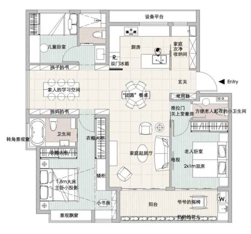平时归家动线,买菜回来从次净收纳间直接进入厨房,避免弄脏餐厅……小孩外出玩耍后,回家了可以户外玩具放入次净收纳。特殊时期,把次净收纳间与厨房的门锁上,从外面回来先在次净收纳间做消毒处理,避免对生活区产生影响。