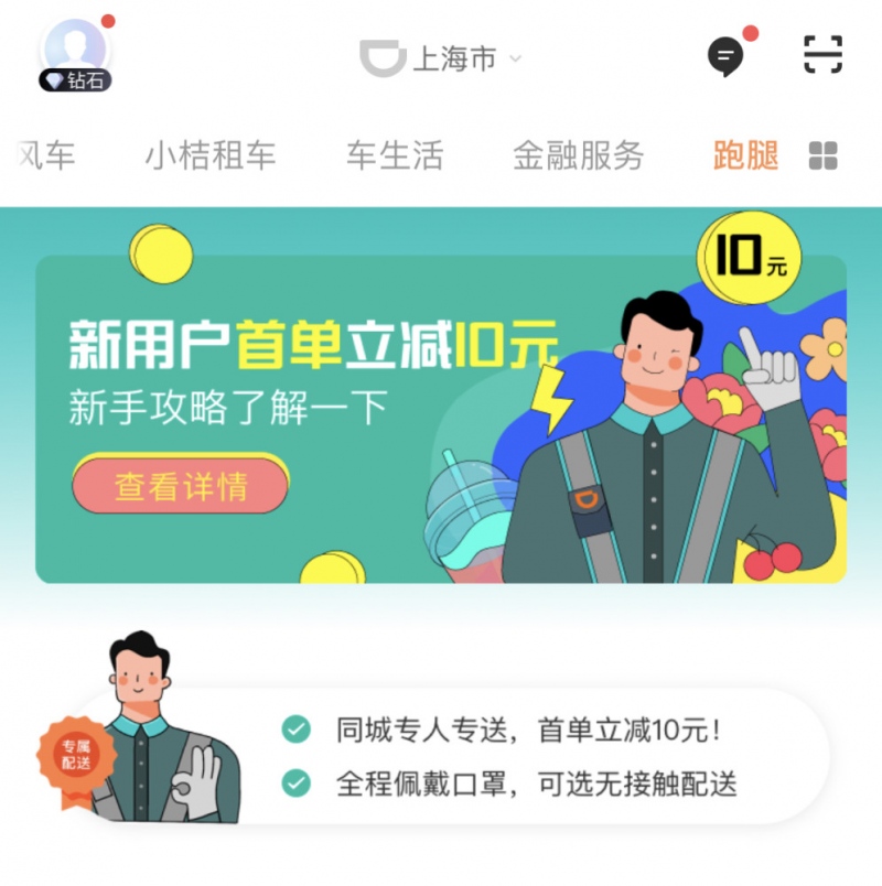 16日上午,记者登录滴滴出行App,并将所在地切换到“上海市”,App界面相对应呈现“跑腿”频道。