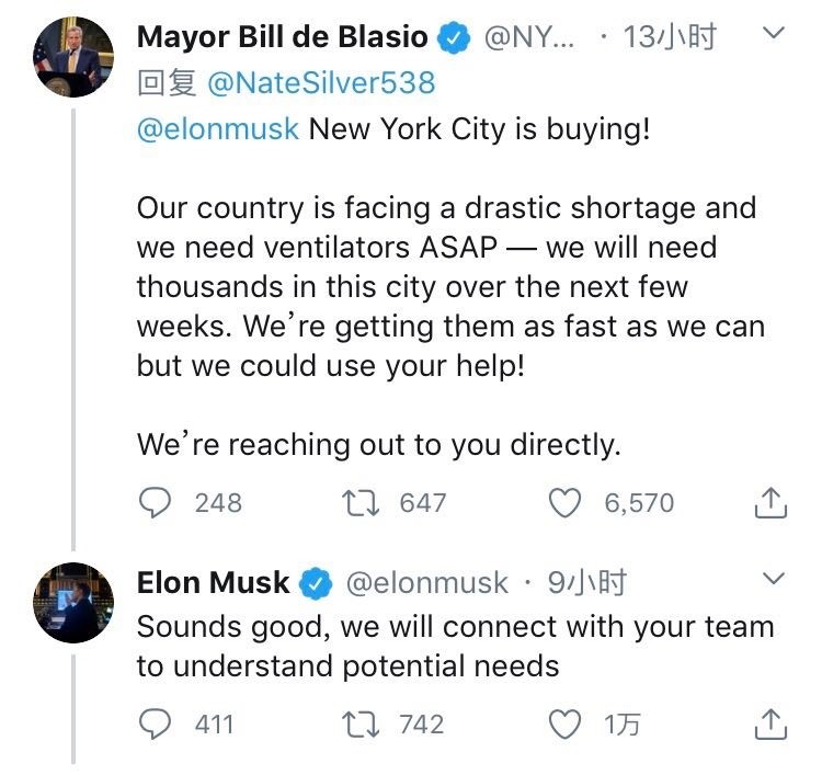 马斯克刚许诺要为新冠肺炎患者造呼吸机,纽约市长就“下单”:需求你的协助,会直接联络你。