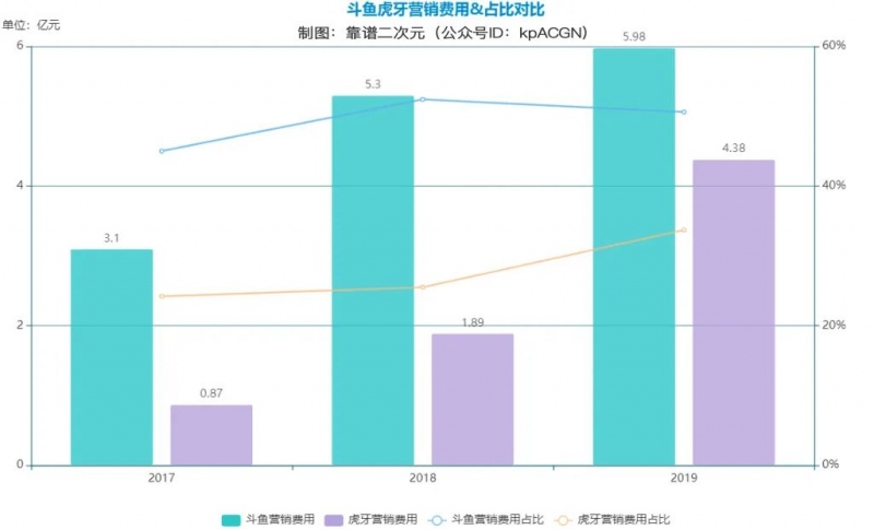 靠谱编辑部(ID:kpACGN)依据财报核算,2019年斗鱼的总本钱占比总收入,由前两年的100%,95.9%逐年下降到83.5%,与虎牙82.3%的本钱占比距离逐步缩小;直播本钱占比也从18年88.7%下降到78.3%,乃至连营销费用都只比上一年多了7000万,占比从52.4%降为50.6%。