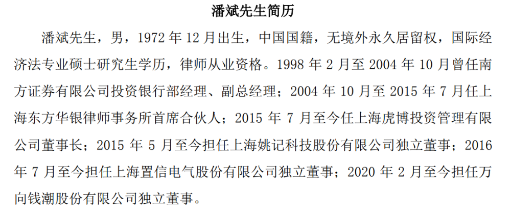 在3月14日“补选独立董事的布告”中看到,潘斌是圈子里的内行,2015年7月至今任上海虎博出资办理有限公司董事长;2015年5月至今担任姚记科技(002605.SZ)独立董事;2016年7月至今担任相信电气(600517.SH)独立董事;2020年2月至今担任万向钱潮(000559.SZ)独立董事。这儿提及了该人士的4项任职。