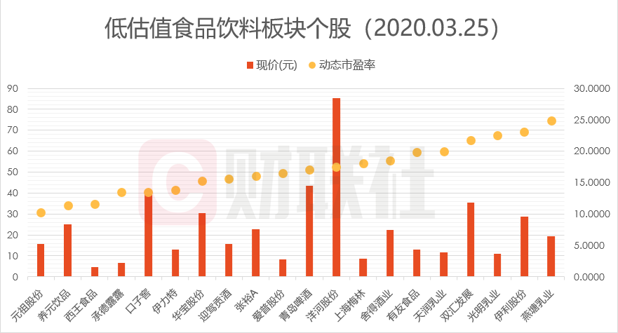 详细到A股商场,食物饮料板块一向防御性较强,然而在本年疫情冲击下,食物饮料指数本年以来跌幅到达10.08%。从现在的估值水平看,当时食物饮料板块内,在低市盈率区间的有20只个股,元祖股份、养元饮品、西王食物、承德露露、口儿窖、伊力特的动态市盈率均在15倍以下,其间最低的元祖股份现在市盈率仅10.25倍,现价为15.68元。
