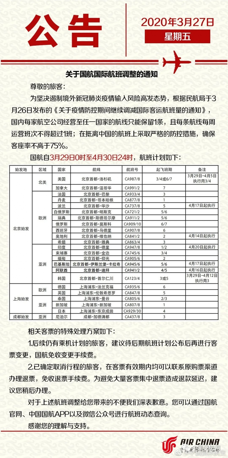 3月26日民航局宣告,国内每家航司至任一国家航线只能保存1条,每航线每周班次不超1班,调减航班自3月29日起开端履行。