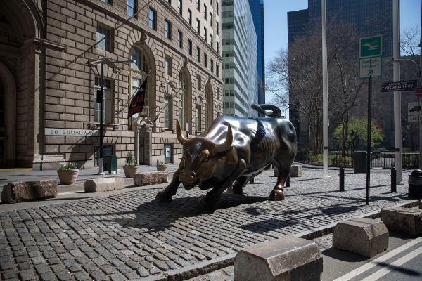 3月26日,美国纽约曼哈顿的华尔街铜牛旁空无一人。(新华社)