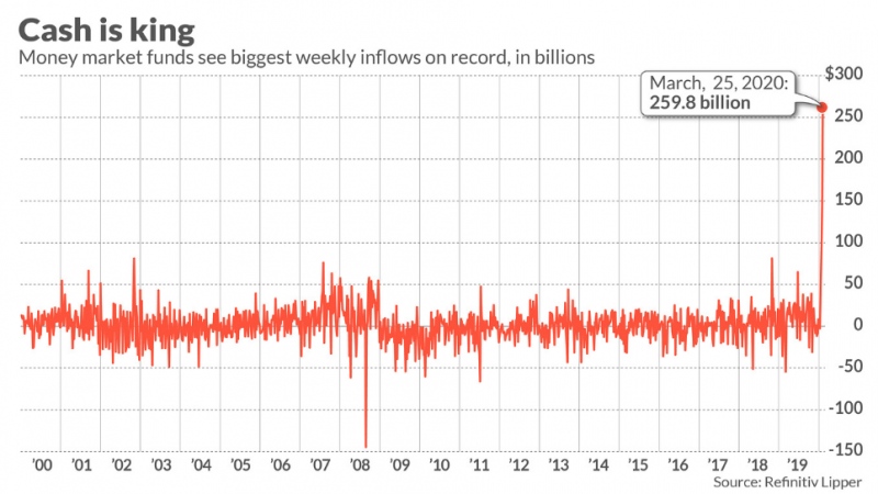 Refinitiv Lipper的多个方面数据显现,最近一周,资金持续快速流入货币市场基金,这是接连第三周创纪录新高。并且每一周的数字都几乎是前一周的两倍:从3月11日当周的876亿美元,3月18日当周的1480亿美元,然后是到3月25日当周的2589亿美元。
