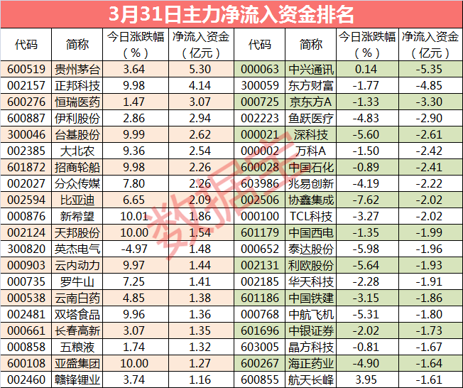 沪指3月31日上涨0.11%,主力资金全天净流出183.21亿元,已接连4个交易日资金呈净流出状况。其间,中小板主力资金净流出31.99亿元,创业板主力资金净流出40.15亿元,沪深300成份股主力资金净流出59.87亿元。