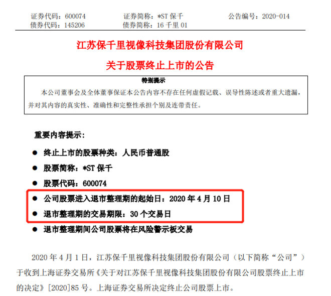*ST保千(以下简称保千里)在4月1日晚间布告称,公司收到上海证券买卖所《关于对江苏保千里视像科技集团股份有限公司股票停止上市的决议》[2020]85号。上海证券买卖所决议停止公司股票上市。这也代表着,*ST保千成为2020年以来榜首家被强制停止上市的公司。
