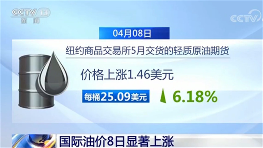 到当天收盘,纽约商品交易所5月交货的轻质原油期货价格继续上涨1.46美元,收于每桶25.09美元,涨幅为6.18%。6月交货的伦敦布伦特原油期货价格继续上涨0.97美元,收于每桶32.84美元,涨幅为3.04%。