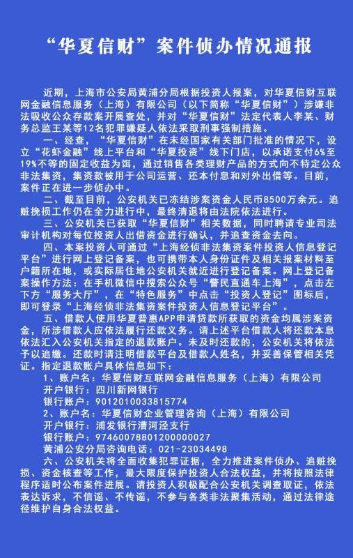 一、经查,“华夏信财”在未经国家有关部门同意的情况下,建立“花虾金融”线上渠道和“华夏出资”线下门店,以许诺付出6%至19%不等的固定收益为饵,经过出售各类理财产品的方法向不特定大众不合法集资,集资款被用于公司运营、还本付息和对外出借等。现在,案子正在进一步侦查中。