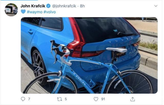 5月18日,谷歌母公司Alphabet旗下无人驾驶汽车子公司Waymo的CEO约翰·克拉夫西克(John Krafcik)在Twitter上发布了一张照片,照片主体是一辆后车窗位置印有Waymo logo的沃尔沃汽车,并配文 “