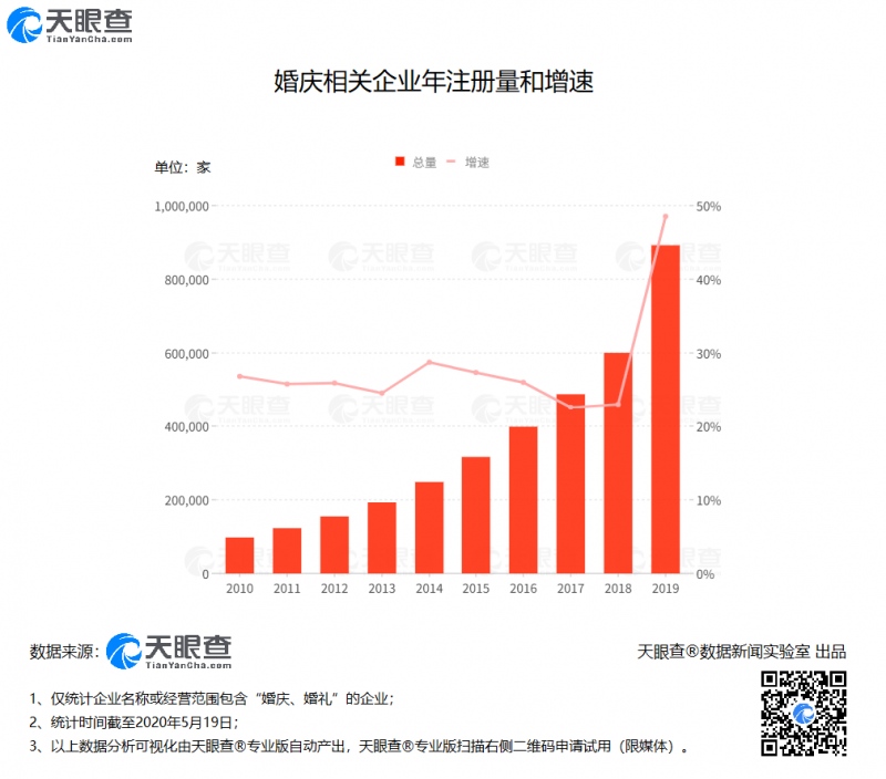 从婚庆企业注册总量(悉数企业状况)来看,2010-2018年期间,我国婚庆企业数量稳步增加,增速维持在20-30%,2019年增速攀至顶峰,达48.53%,当年新增超29万家相关企业,为前史之最。据我国工业信息网发布的数据猜测,2020年我国成婚登记人数将会创五年来新高,到达1238万对,成婚消费也将达近3万亿之高。