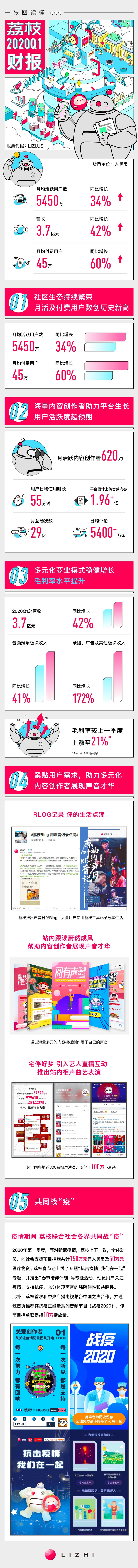 荔枝创始人兼CEO赖奕龙在成绩陈述电话会议中表明:“2020年第一季度,咱们继续加强荔枝作为一个持续增加的UGC渠道的领先地位,为用户们供给多样的音频内容产品和交互式音频文娱体会,具有强壮的潜在商业化才能。咱们渠道的社区驱动形式使咱们得以加强内容创造者和用户之间的联络,不断探究新的时机。第一季度,咱们音频文娱业务收入增加仍旧微弱。与此一起,咱们在新的商业变现方案方面也取得了活跃的发展,例如粉丝会员方案、付费内容、广告和游戏等”。