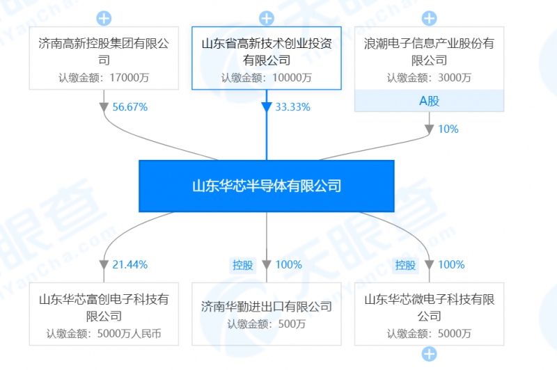 天眼查信息显现,华芯半导体的注册资本为3亿元人民币,董事长李金为法定代表人。此外,济南高新控股集团有限公司(济南高新技能产业开发区国资管委会全资控股)为最大股东,控股56.67%;鲁信创投持股33.33%;浪潮信息持股10.00%。