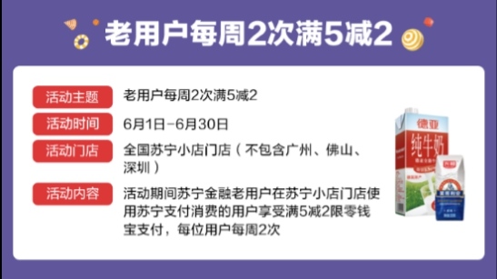 即日起至6月30日,在全国苏宁小店门店,使用苏宁金融APP扫码支付,苏宁金融新用户享五折最高立减10元优惠,这是新人才有的专享特惠。