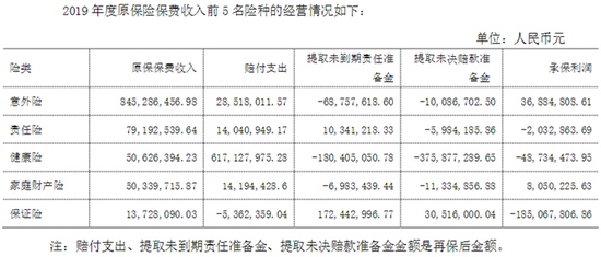 易安保险2019年报显示,在其承保的5类产品中,意外险与家庭财险险实现盈利,保费收入分别为8.45亿元、0.5亿元,承保利润分别为0.37亿元、0.08亿元。而责任险、健康险、保证险则出现亏损,保费收入分别为0.79亿元、0.51亿元、0.14亿元,承保利润分别为-0.02亿元、-0.49亿元、-1.85亿元。