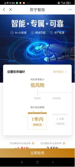 在用户体验方面,苏宁金融科技让用户一键享受专业投顾。用户只要登陆苏宁金融APP,选择“基金”栏目,点击“苏宁智投”即可一键选购。在选购前还有风险测评环节,通过问卷调查对用户的风险承受类型进行评估,并根据相应的风险偏好自动为用户推荐投资策略组合。