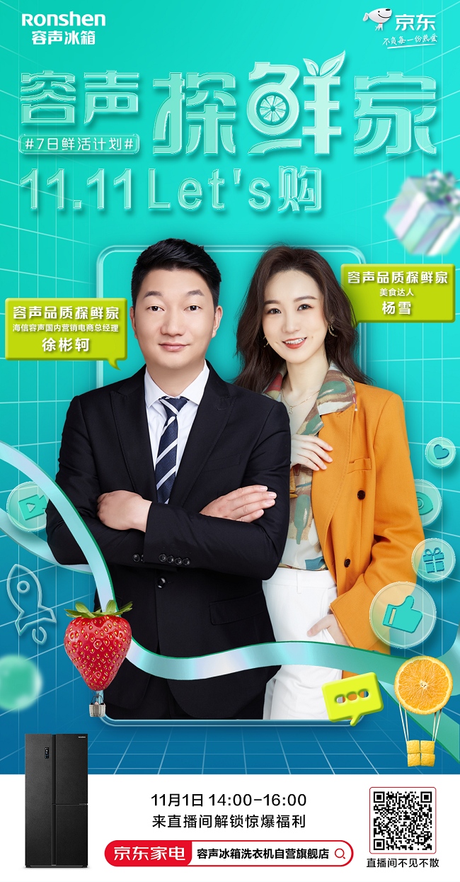 在今年的双11狂欢购物节,容声更是推出了主题为“容声探鲜家 11.11 Let’s购”,话题为#7日鲜活计划#的探鲜活动,为大家送上一系列容声宠粉福利活动。先后进行了三场「总裁价到」专场直播,囊括京东、天猫两大平台。先有容声总裁徐彬轲先生空降直播间送福利,后有副总裁林朝晖先生联手B站百大UP主“啊吗粽”,一起敲响双11战鼓,实实在在用行动拥抱这次电商狂欢节。