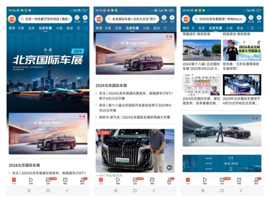 当海量网友进入北京车展频道时,映入眼帘的不仅仅是2024北京车展最新动态,还有热门车型的关键信息,比如红旗HQ9 PHEV海报赫然出现,极具视觉冲击力,再结合一汽红旗车展现场直播,大大提升了用户对一汽红旗的品牌认知度。